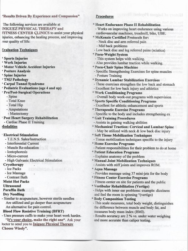 Iniguez Physical Therapy is an outpatient physical therapy clinic. Two facilities to choose from, Silver City NM, and Bayard NM. Physical Therapist has 30+ years of experience.