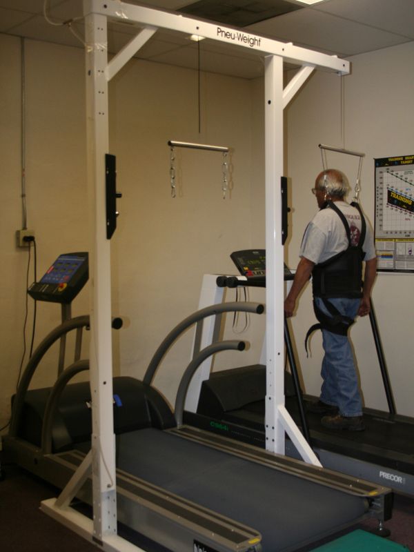 The Pneu-weight system is a unique apparatus to our clinics. It utilizes compressed air and a harness which suspends the patient’s weight in a vertical direction and has the capacity of 0 lbs to 350 lbs. The machine lifts the patient’s weight upward so the joints such as the low back, hips, knees, and ankles experience less weight forces as they perform walking tasks on a treadmill. The Pneu-weight system has the same benefits of water, except, this apparatus can distract up to 100 % of the individual’s weight vs. water is limited to 10-15 %, depending on body fat content.