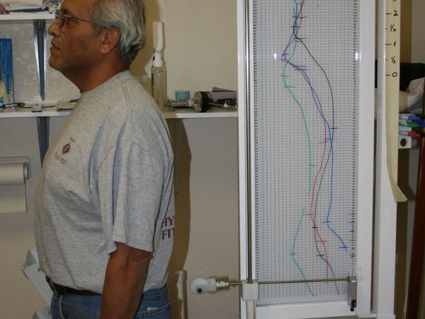 Furthermore, since an initial trace of the individual’s posture was performed, a follow-up tracing can be superimposed on the original to compare and measure change. The readout of this apparatus gives the individual a visual view of their posture which assists in having them realize what is required to change and also a copy is given to them for reference. The posture gage is utilized in conjunction with the Pneu-chair spine apparatus.
